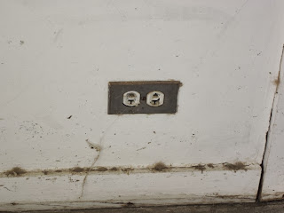 A close-up of the electrical outlet. This was long before the days of the three prong outlets that are now standard in North America. I believe these sockets were last used in 1962. 11/30/11.